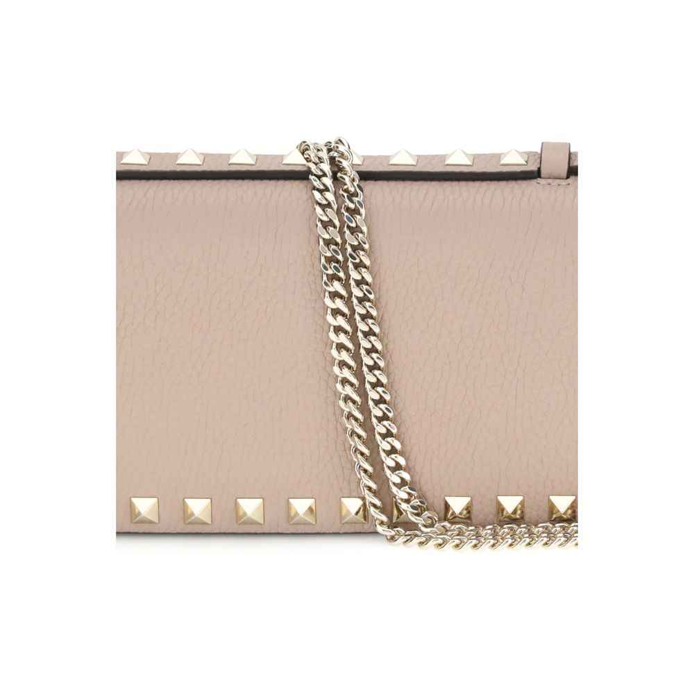 Valentino Garavani grained leather Wallet with top handle and chain shoulder strap for a dual mode of use. It features the iconic Rockstud studs applied on the perimeters and front flap closure equipped with a magnetic button. Inside, a single compartment with zippered welt pocket to better organize your essentials with style and functionality.