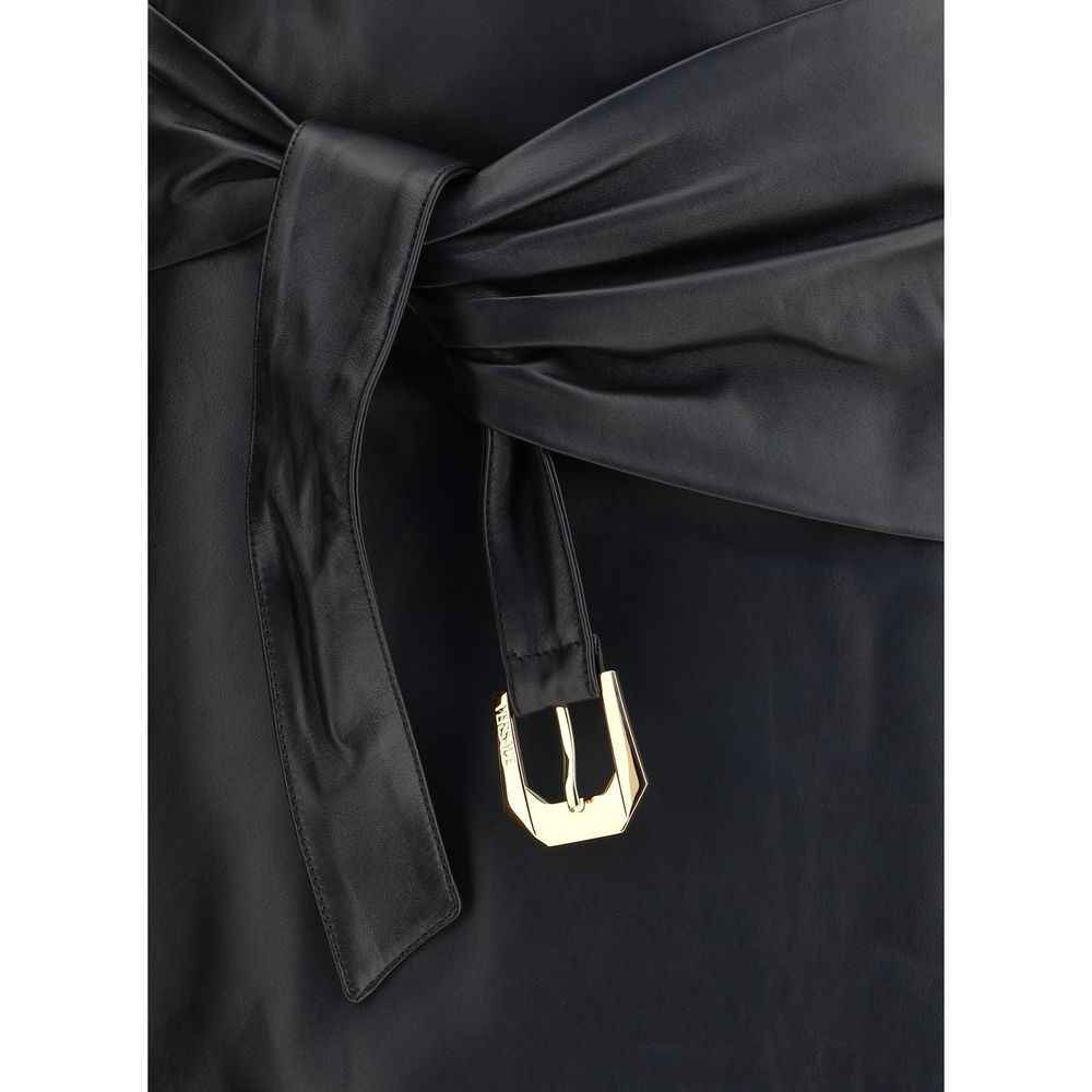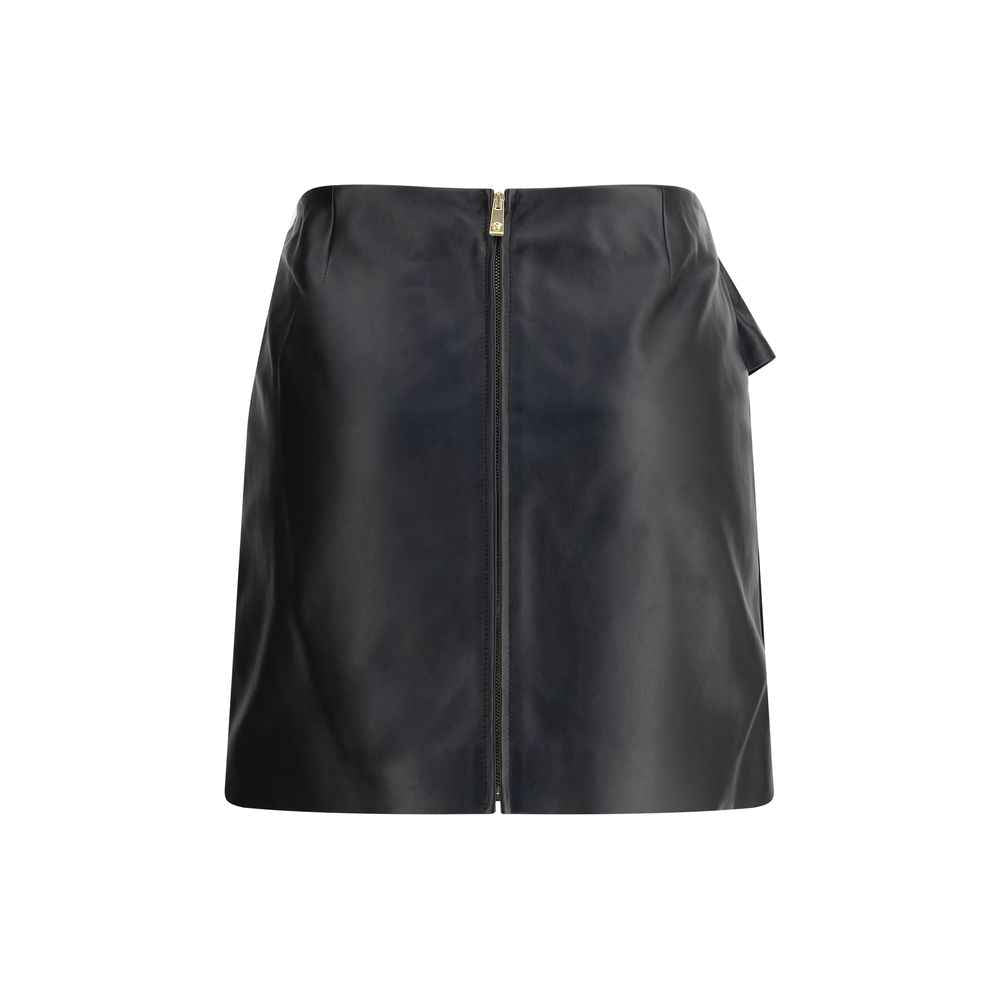 The Versace lambskin Miniskirt is a bold and sophisticated piece, enriched by an elegant decorative knot on the front that adds dynamism to the design. Crafted from soft leather, it features a zip fastening on the back for a precise and sensual fit, in perfect Versace style.