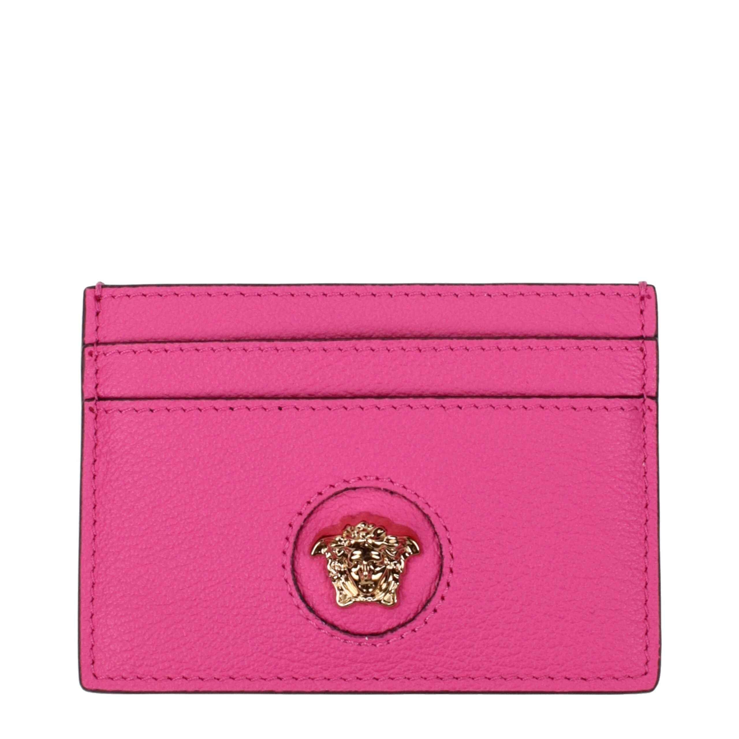 Elevate your accessory collection with the Versace Pink Leather Cardholder. Crafted from luxurious fuchsia leather, this chic document holder showcases a striking front detail and a signature back logo. Perfect for keeping your essentials stylishly organized, this cardholder is a must-have for those who appreciate high fashion and practicality. Make a statement with Versace today!