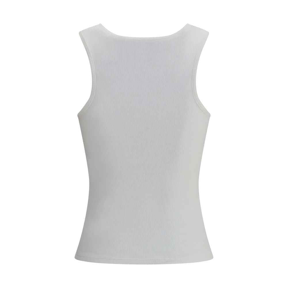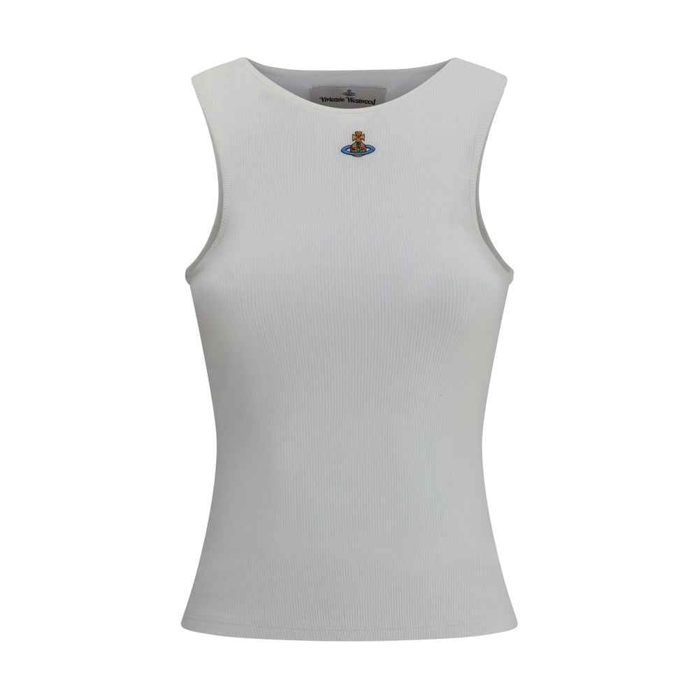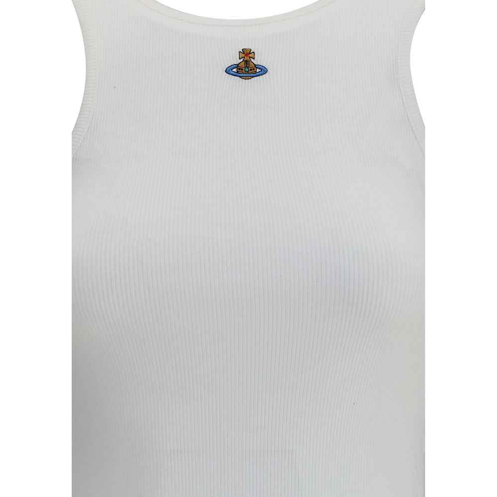 Vivienne Westwood’s Top features a round neckline and a ribbed design that enhances the fit. An embroidered logo patch stands out on the front, an iconic detail that gives the garment a distinctive, contemporary touch.